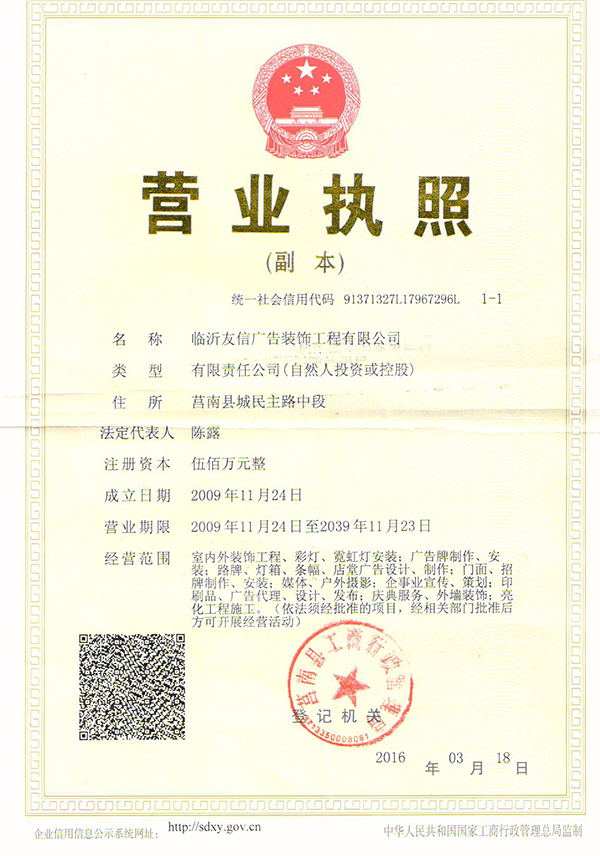 臨沂市友信廣告裝飾工程有限公司是一家從事外漏LED銃孔發光字、亞克力吸塑發光字、不銹鋼發光字、霓虹燈、銅字標牌、樹脂字、樹脂發光字、環氧樹脂發光字,不銹鋼字牌、鈦金字牌、金箔字、貼金字、水晶字、不銹鋼燈箱字、超高亮LED燈箱字、發光燈箱牌、以及鋁合金導向牌、弧面標牌等專業設計與施工的公司。
